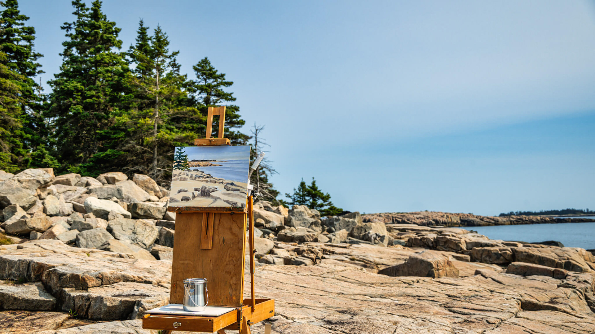 An artist view of the Schoodic Peninsula, a quieter, mainland section of Acadia National Park in Winter Harbor, ME, features rugged, granite coastlines, pine-birch forests, and panoramic ocean views.