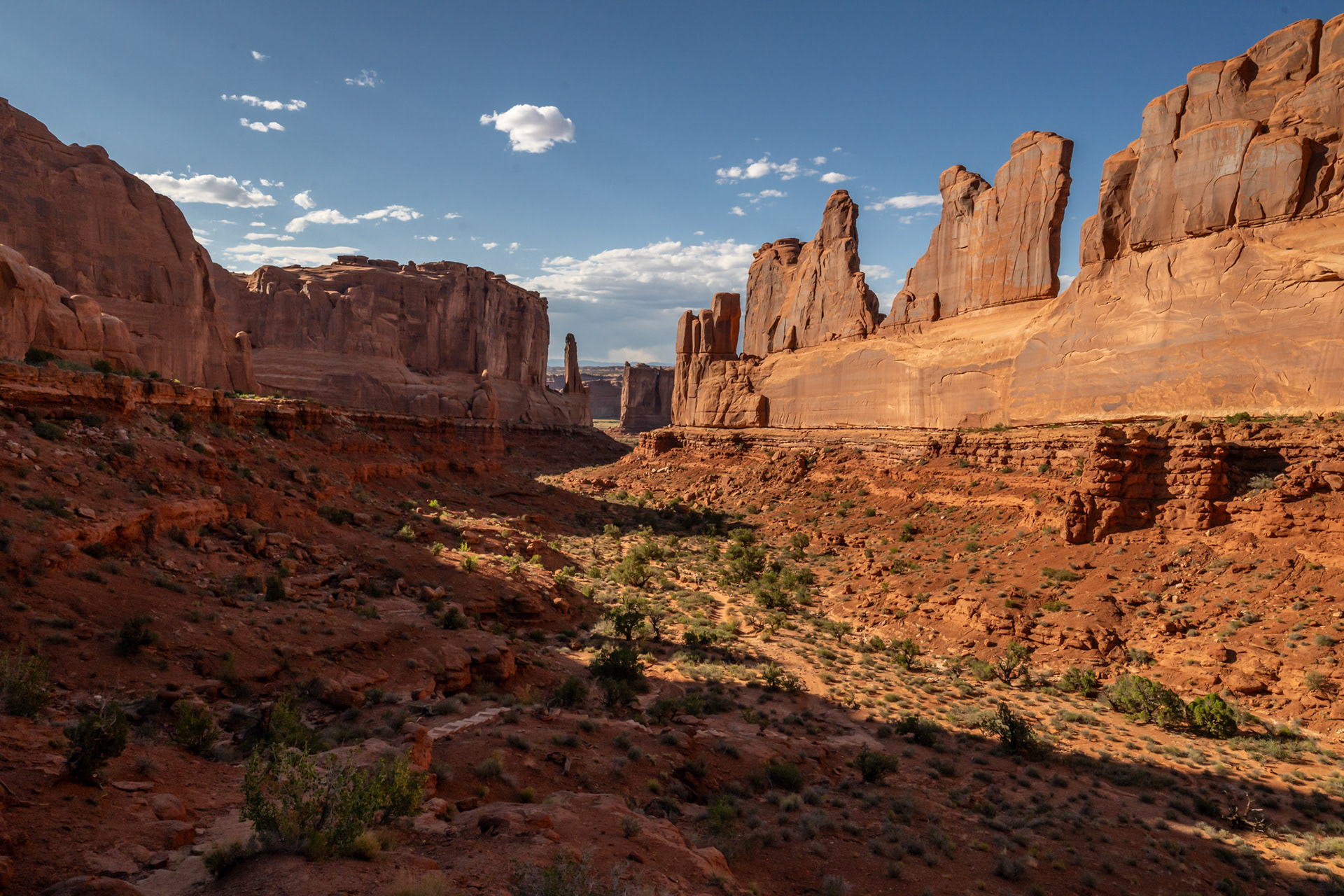The Park Avenue area featuring towering sandstone walls and towers, some of which are over 600 feet tall.