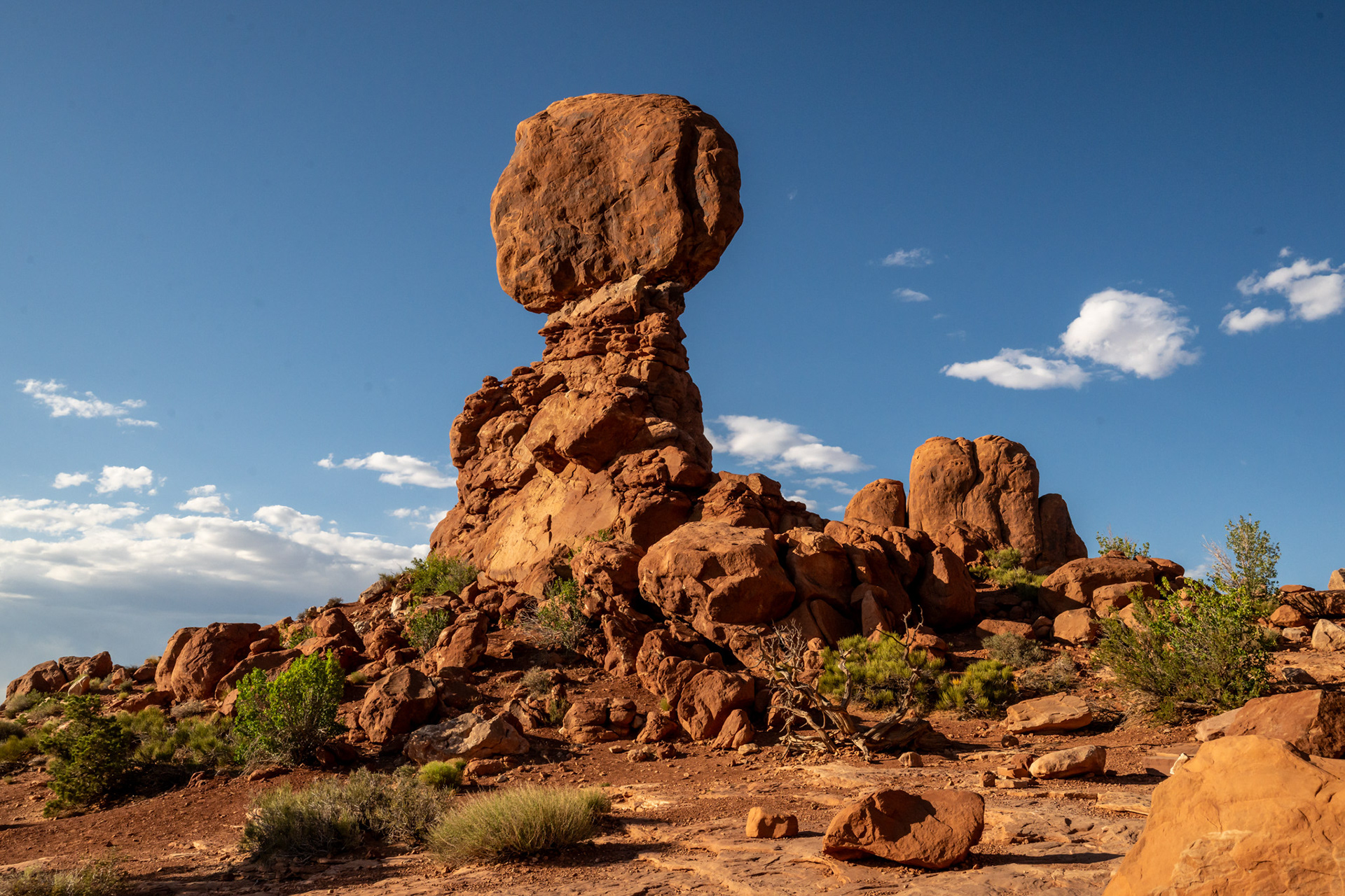 Balanced Rock, a large sandstone boulder precariously resting on a narrow rock column.