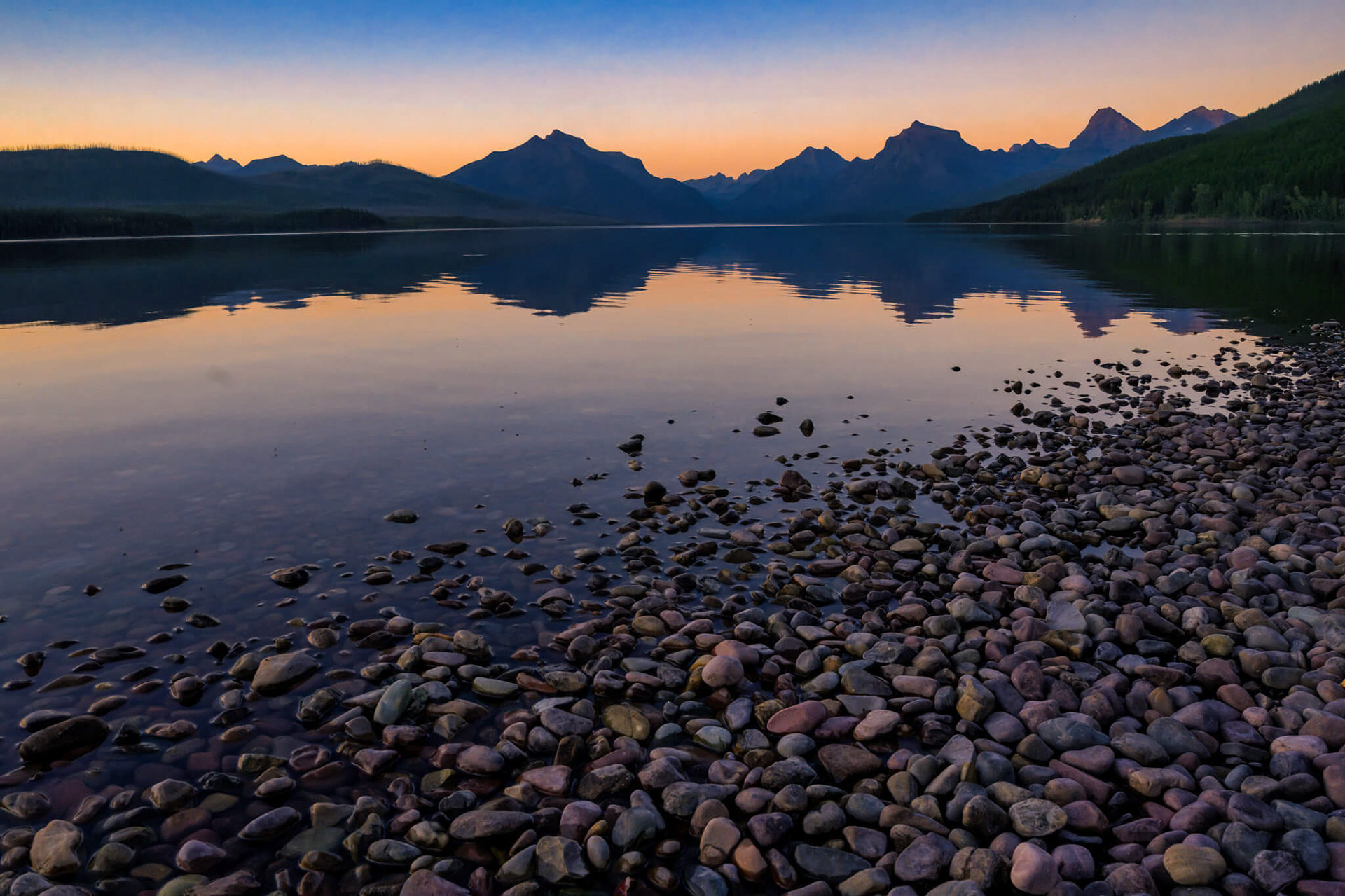 Lake McDonald at sunset with the iconic colorful rocks along the shoreline.