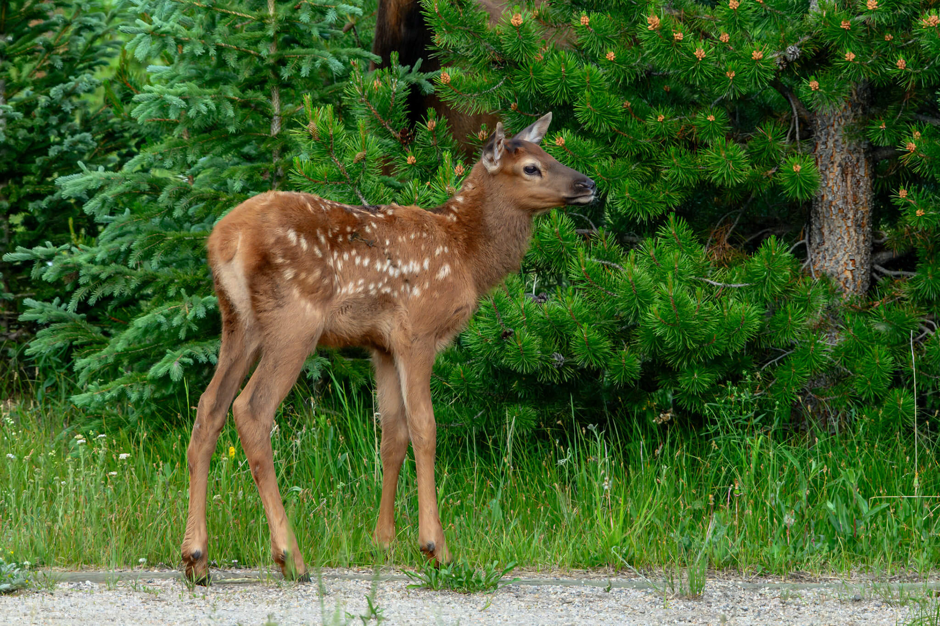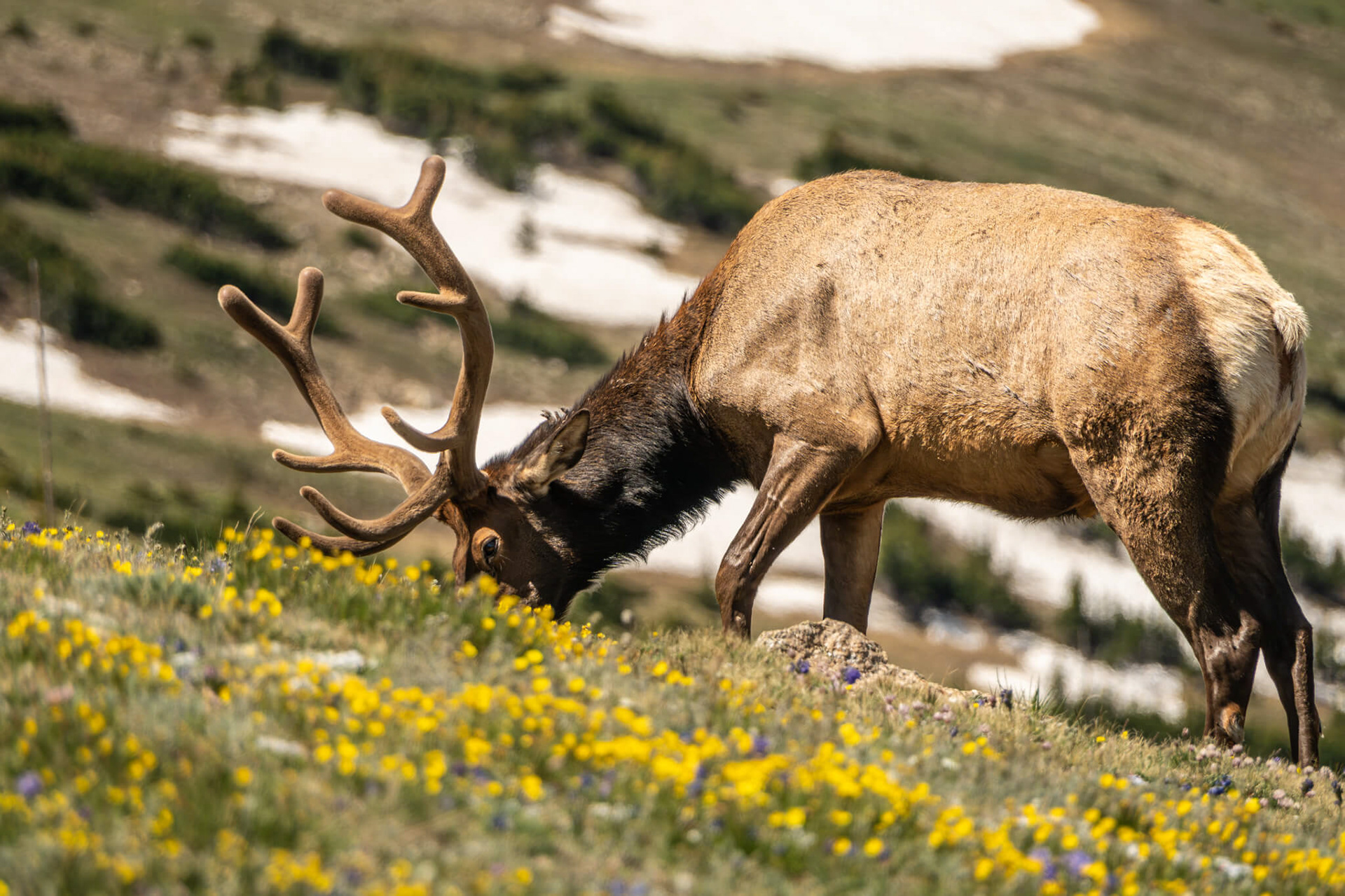 A Rocky Mountain bull elk foraging among the wildflowers. This photos was taken along Trail Ridge Road, the highest continuous paved road in the United States. It is 48-miles one-way across Rocky Mountain National Park and climbs to an elevation of 12,183 feet above sea level. Even in July there are still patches of snow.