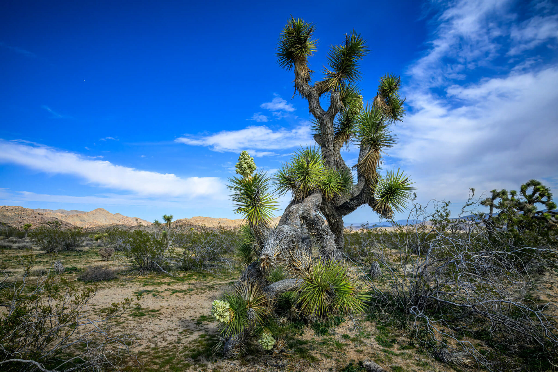 Joshua trees produce clusters of creamy-white, bell-shaped flowers at their branch tips, typically blooming between February and April.