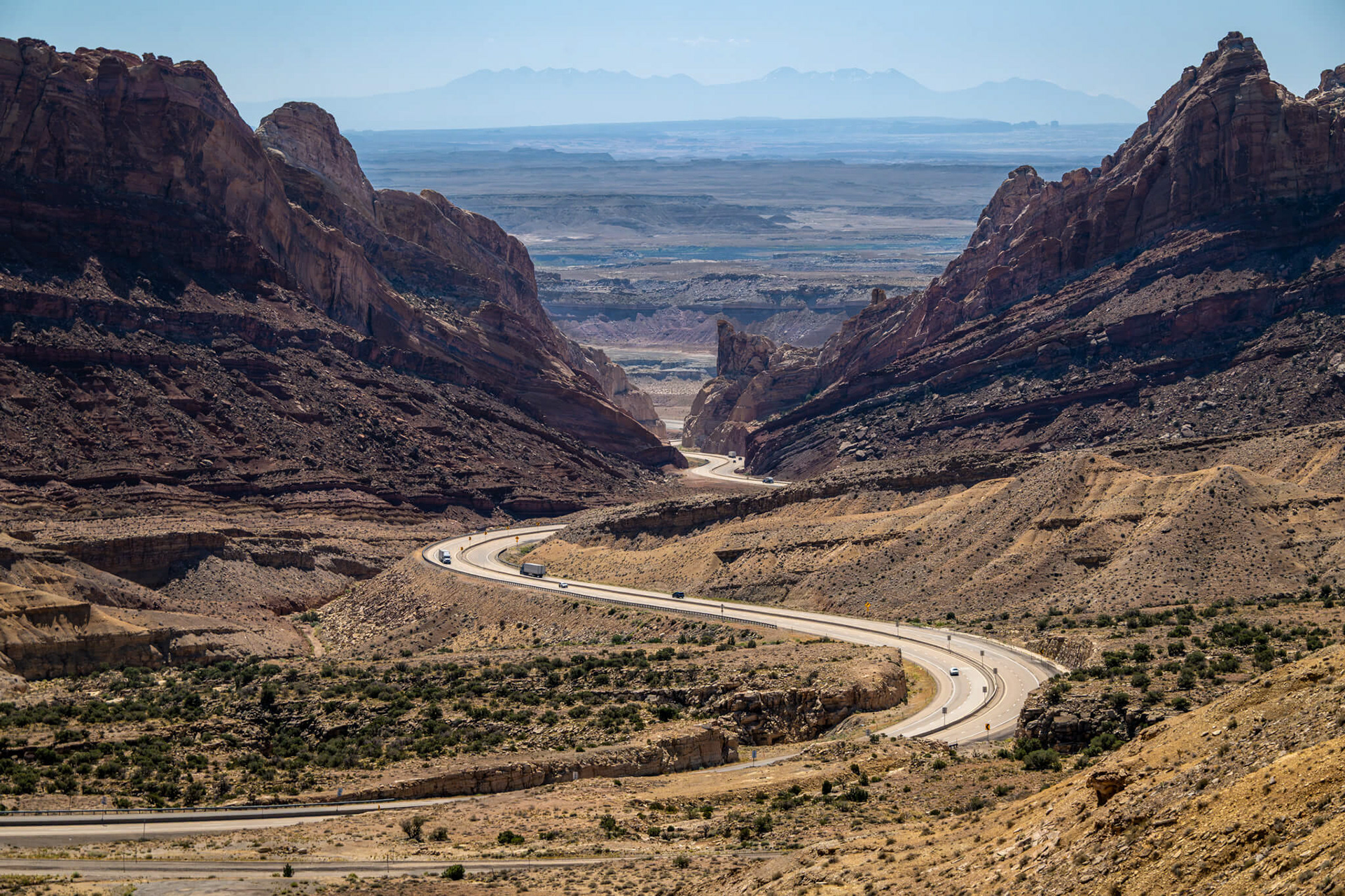 The interstate 70 through Spotted Wolf Canyon at the eastern edge of the San Rafael Swell in Utah. This area is known for it's desolate beauty. Although there are rest areas and runaway truck ramps there are few services along this 100 mile stretch of the interstate.